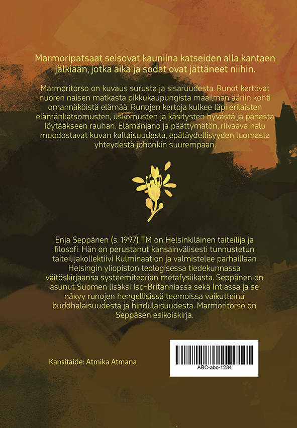 Enja Seppänen on helsinkiläinen taiteilija ja filosofi, jonka työssä yhdistyvät teologinen ajattelu sekä kokemus ja tunne yhteydestä. Hän sukeltaa esikoisteoksessaan hengellisiin traditioihin ja universaaleihin, eksistentiaalisiin kysymyksiin intiimillä tavalla, joka resonoi pitkään lukemisen jälkeenkin. Marmoritorso ei tarjoa valmiita vastauksia – se tarjoaa tilan tuntea, eksyä ja ehkä löytää jotain olennaista itsestä.